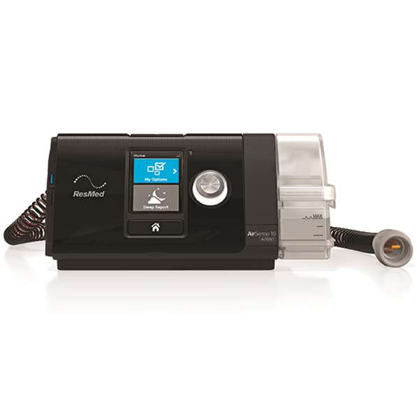 ResMed’s premium auto-adjusting pressure device with wireless communications and integrated humidifier. Implements advanced event detection, including CSA and CSR detection, as well as remote diagnostic information in myAir™. Optional pulse oximetry monitoring available. Modes include AutoSet™, and CPAP.